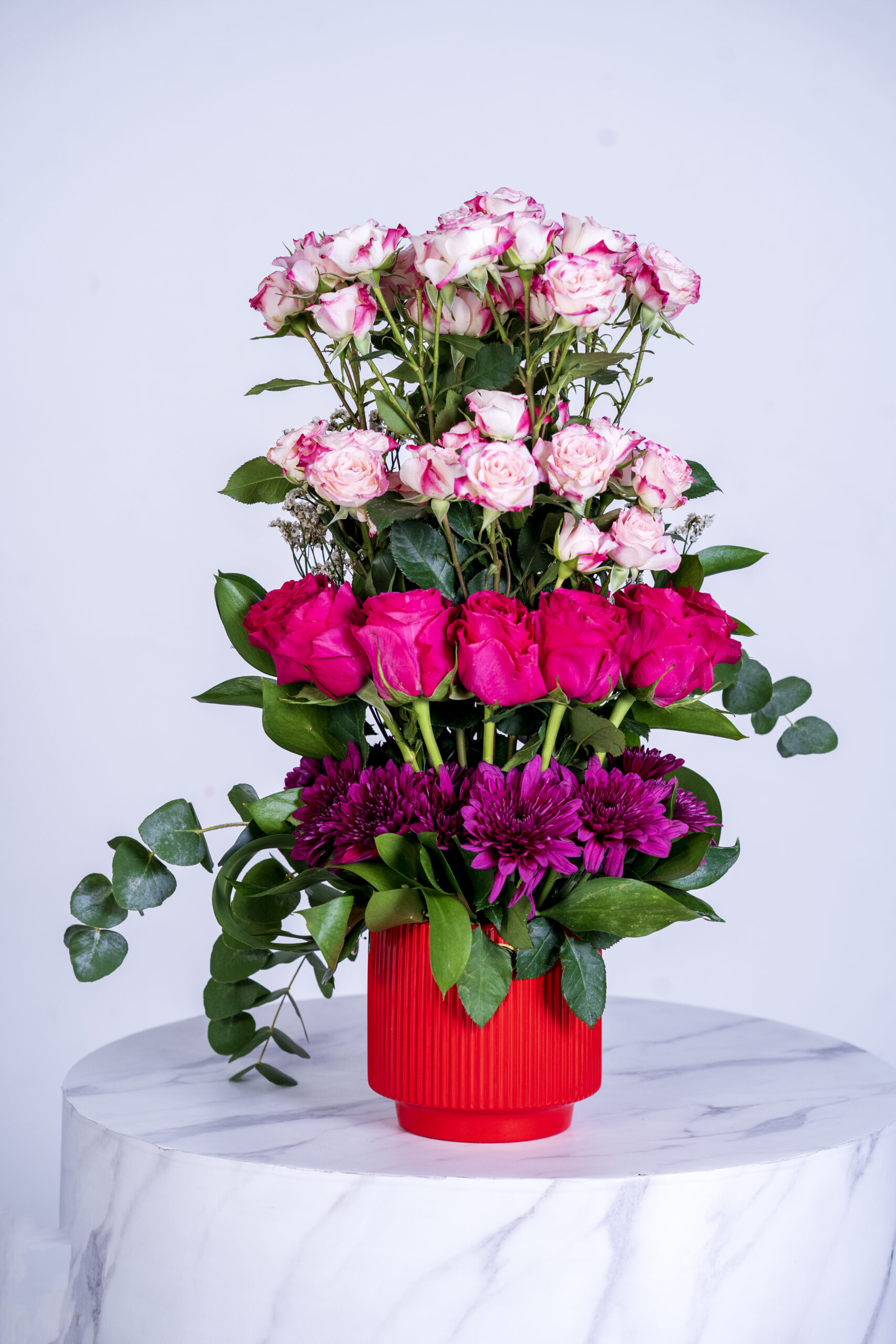 Home Flowers Baby rose pink double coloure and fooshy rose purple Christhymum ceramic pot aragement