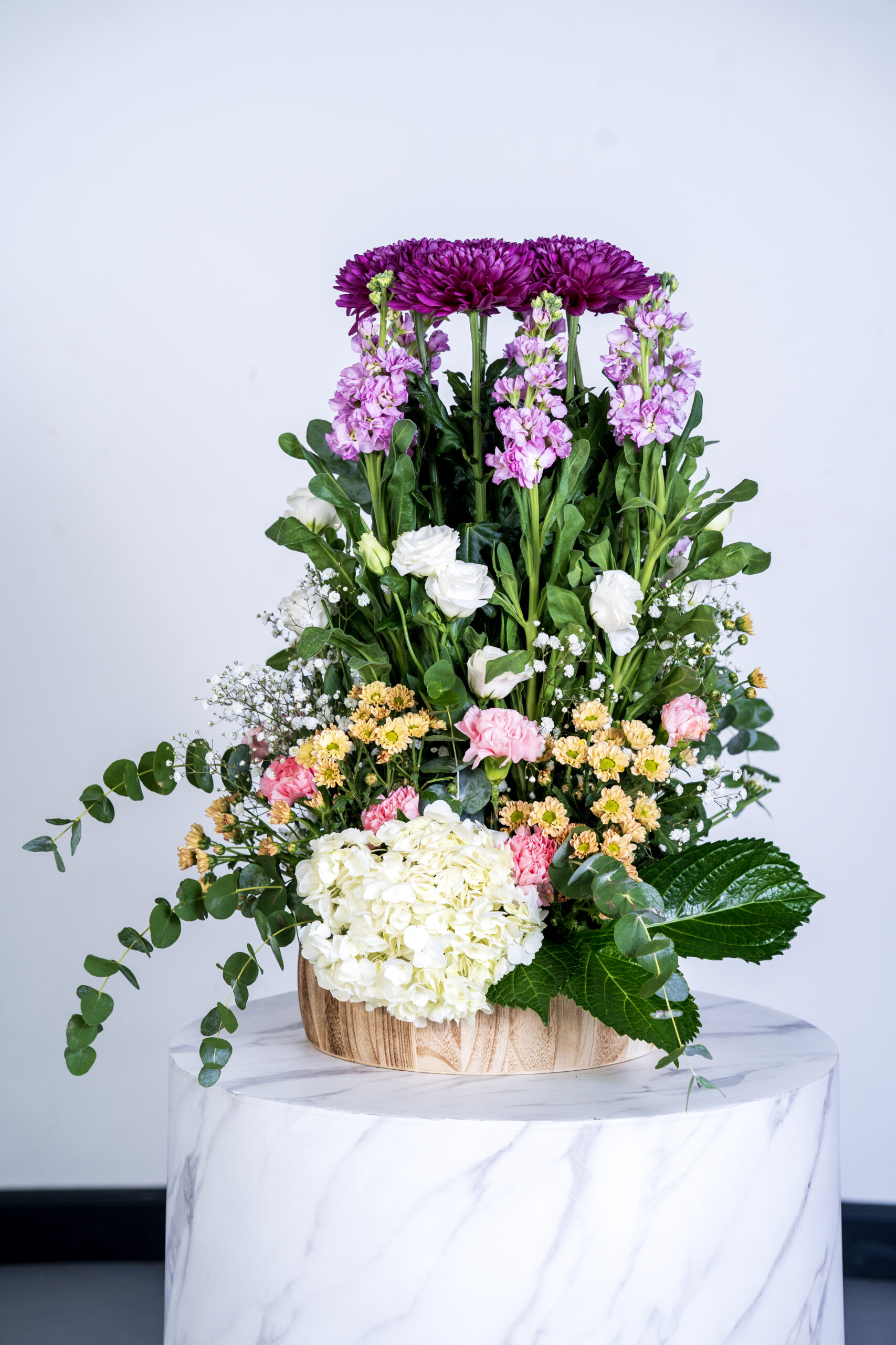 Delistar purple and mathiola and vesiayanthus and baby chrysantimum and carnetion pink chrysantimum white wooden pot aragement