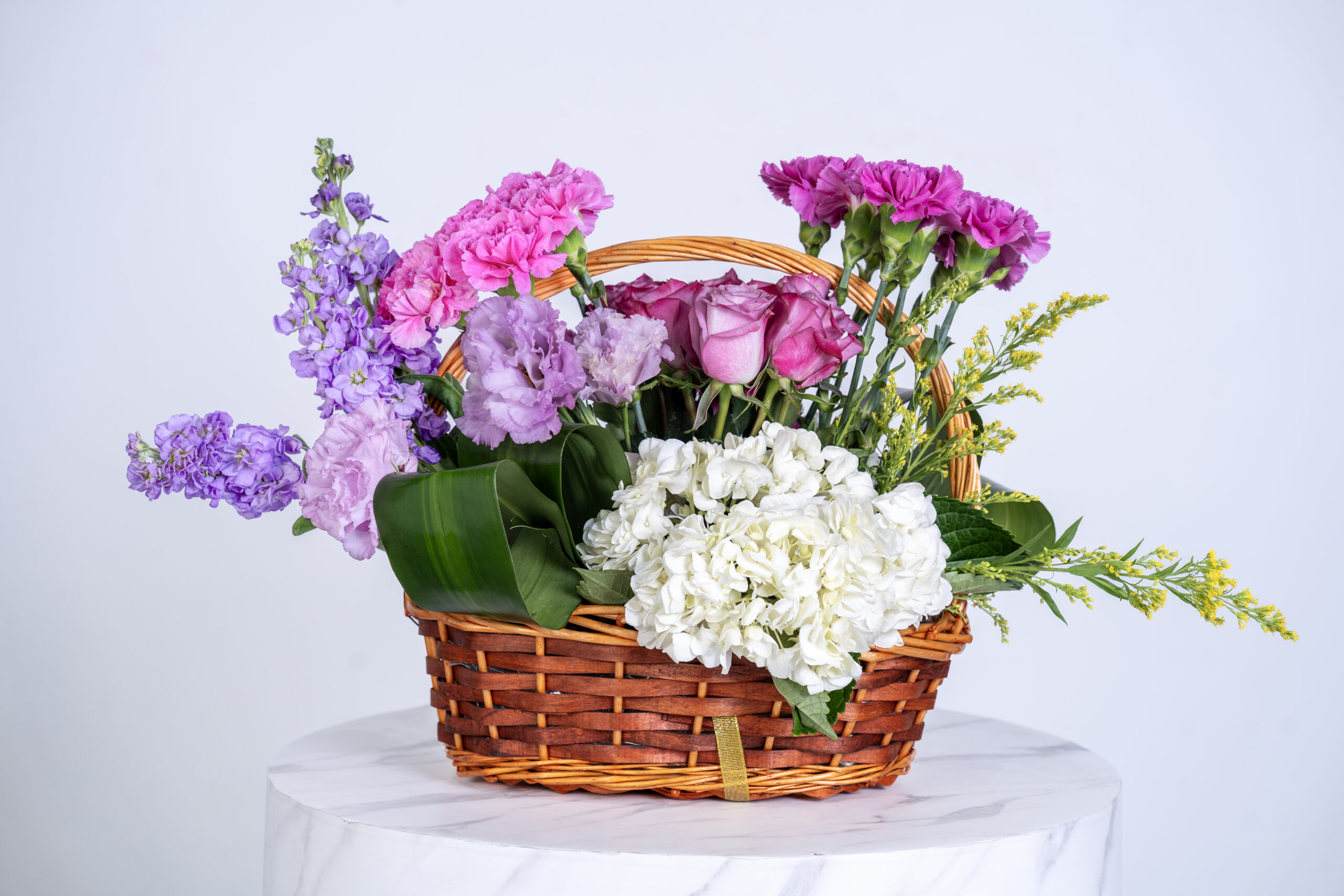 Mathiola purple and rose and carnetion purple hidrengia and soled aster basket arrangement