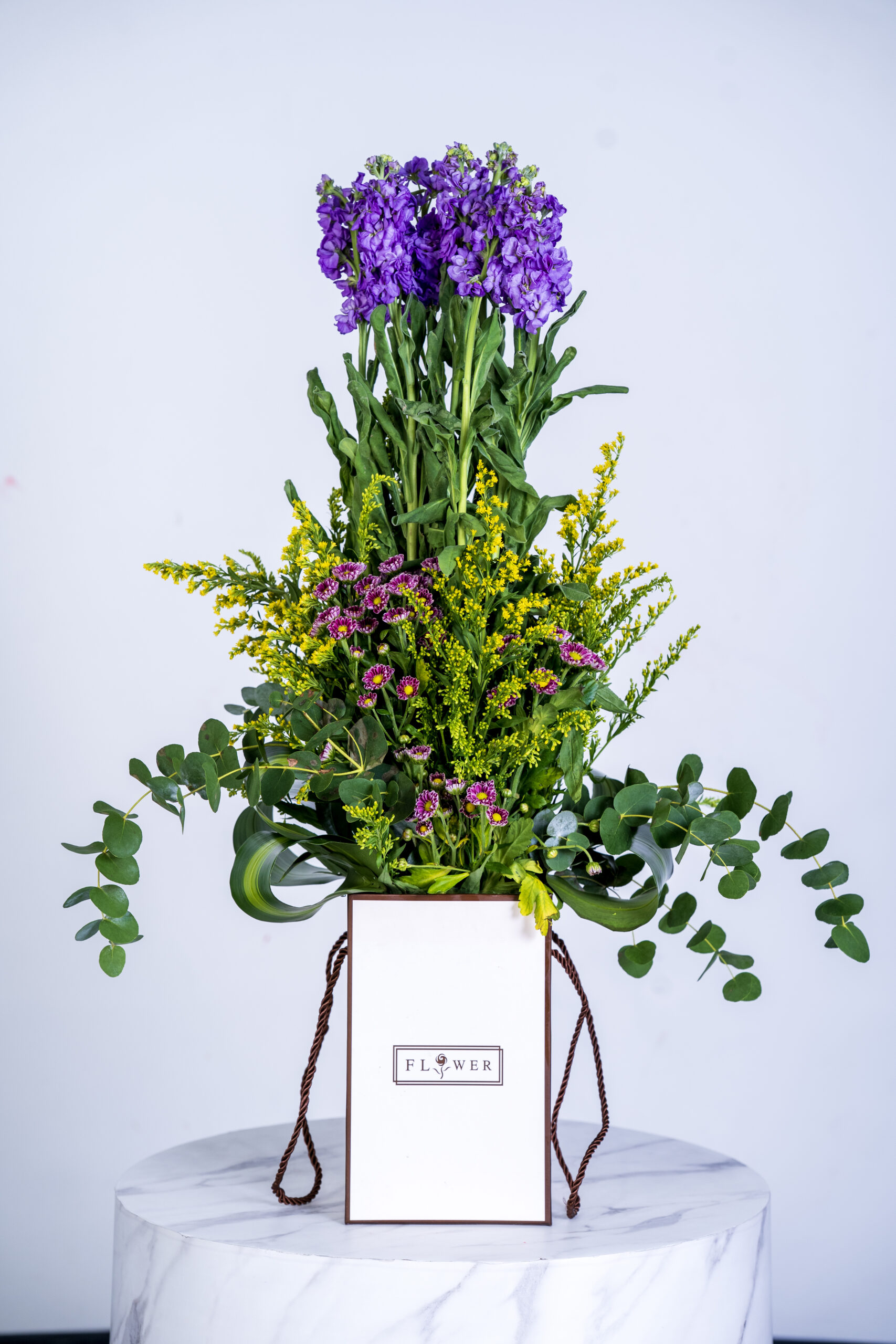 Mathiola Purple, Soledaster & Baby Chrysanthemum Cliptus Box Arrangement