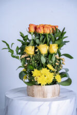 Be the first to review “Orange rose yellow rose and cliptus green Chrysantimum yellow wooden pot aragement” Cancel reply