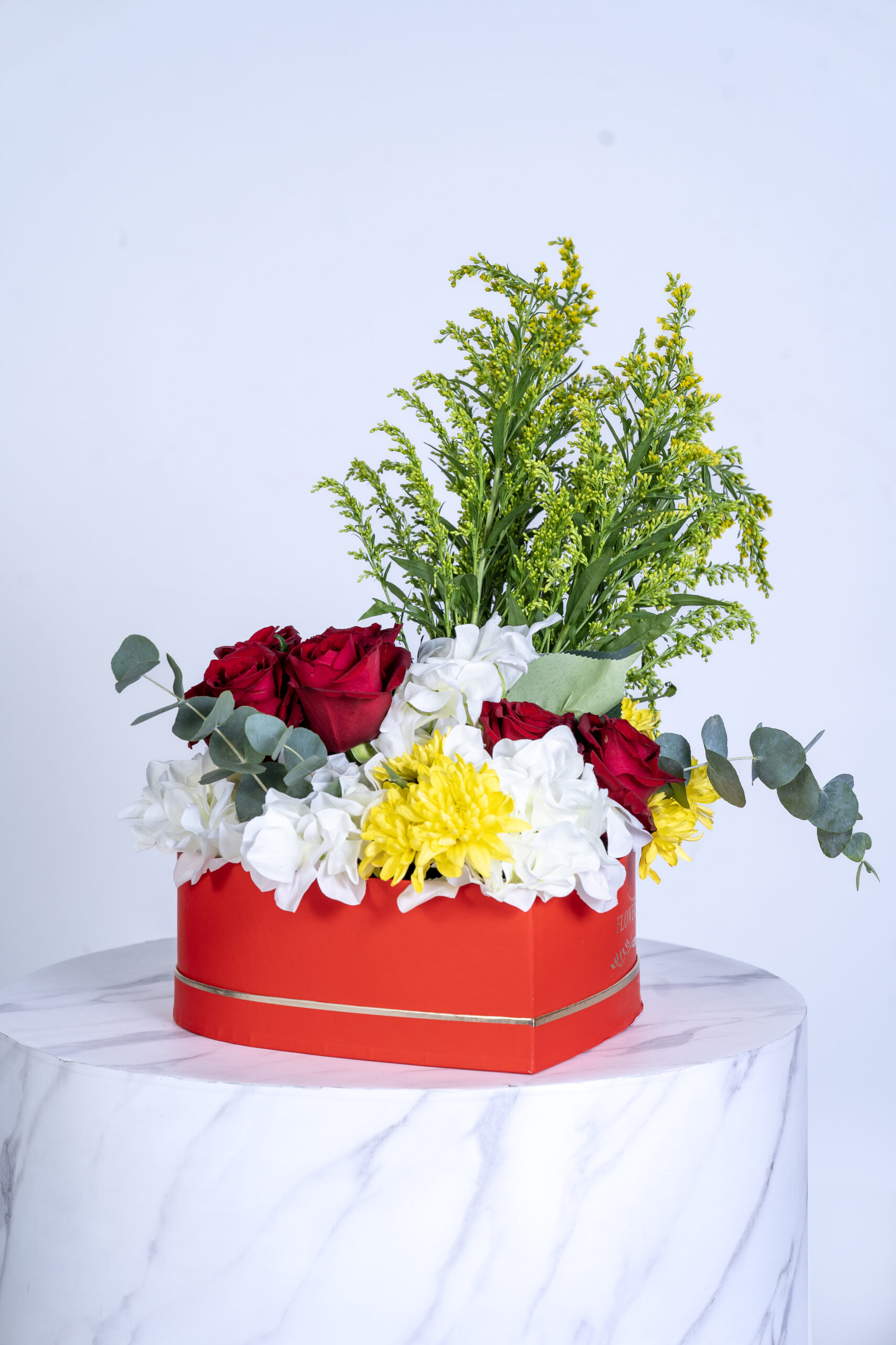 Artificial Peonic Rose, Mixed Colors & Sambedium Round Box Arrangement